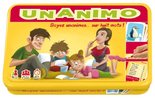 | Asmodee - UNA - Jeu d'ambiance - Unanimo #Jeu de vocabulaire pour tous. On retourne 1 carte sur laquelle figure 1 dessin et 1 mot (par exemple: canard). Tous les joueurs écrivent 8 mots que lui inspire la carte. Puis chacun lit ses mots. Ce sont les réponses communes qui font marquer des points. Si 4 joueurs ont écrit le même mot, chacun marque 4 points. Si on est seul à avoir trouvé un mot, on ne marque pas de point. Il faut être ... unanime! Contenu: 110 cartes unanimo, 1 bloc de feuilles de scores, 4 crayons + règle dans une boîte de rangement en fer (19,5 x 13 cm).. Nb joueurs : 3 - 12. Durée : . De 7 ans à 120 ans.